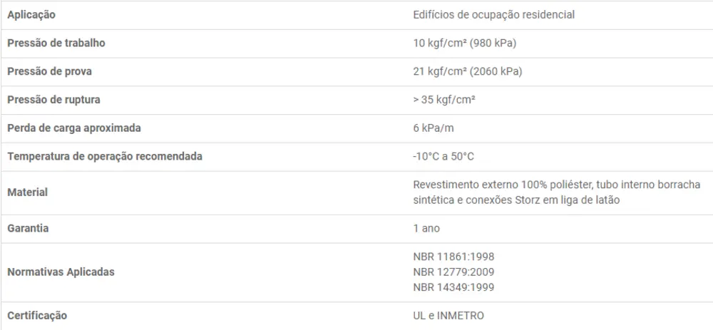 Possui revestimento têxtil 100% poliéster, tubo interno em borracha sintética e uniões Storz fabricadas em latão.