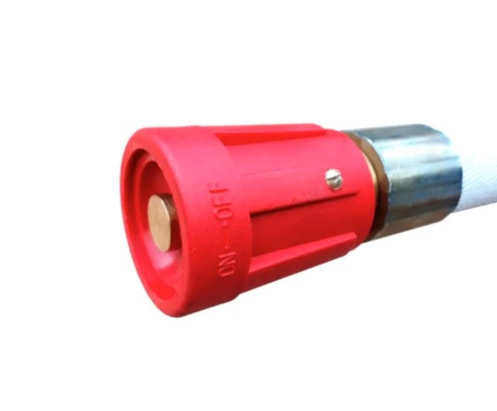 Esguicho: Corpo interno em latão e manopla para regulagem de abertura e fechamento em borracha vermelha